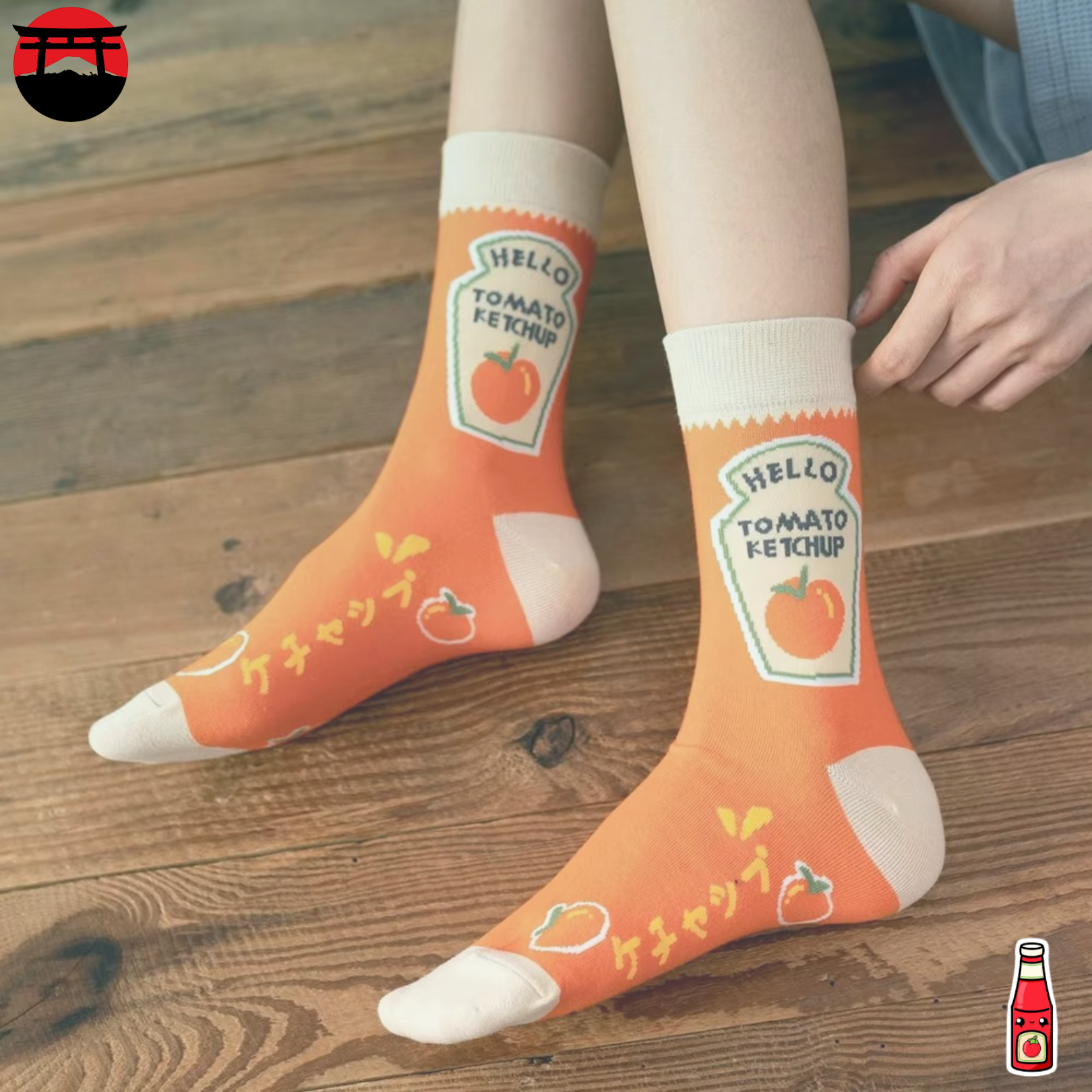 Socken wie aus dem Regal eines Tokyo Mini-Markts – bunt, ikonisch und etwas schräg. Tomatenlabel trifft Milchkarton, Pfirsich auf Punktmuster. Ideal für alle, die japanisches Design lieben. 🏮