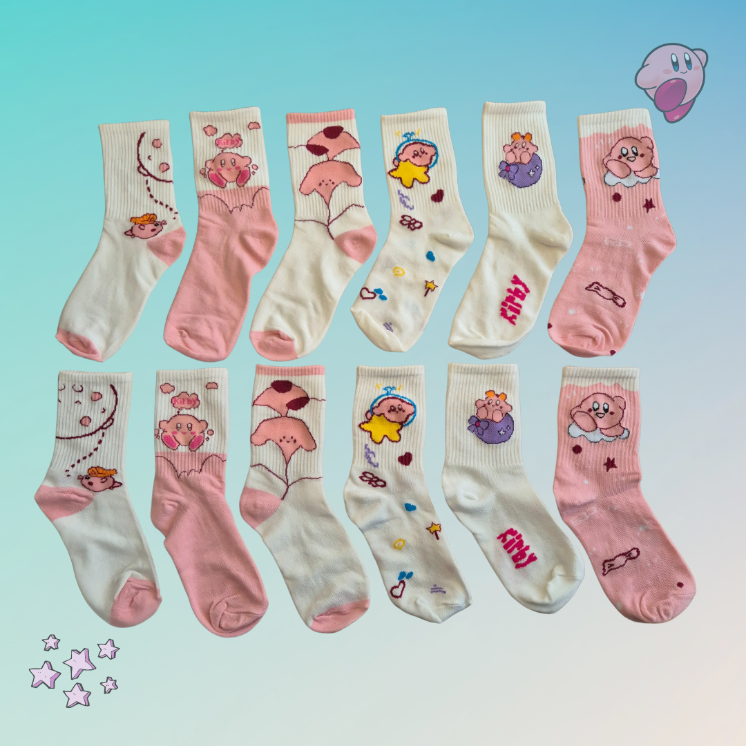 Mit diesen Socken hast du Kirby immer an deiner Seite – oder besser gesagt an deinen Füssen! Fünf verschiedene Designs zeigen ihn in all seinen fröhlichen und lustigen Posen. Gemütlich, stylisch und ideal für echte Fans! 🌟💖